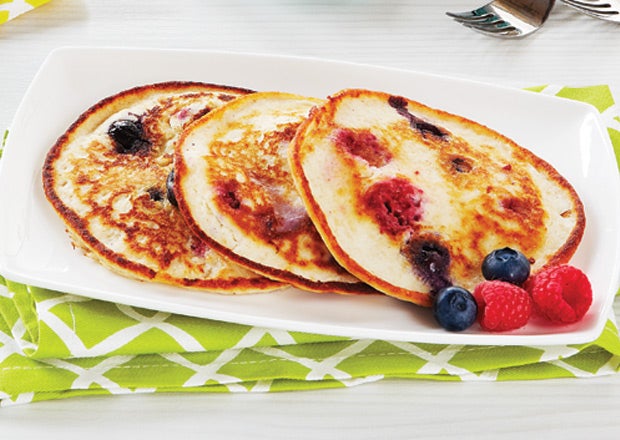- Blend pancake ingredients in a blender. Once blended, stir in raspberries and blueberries.