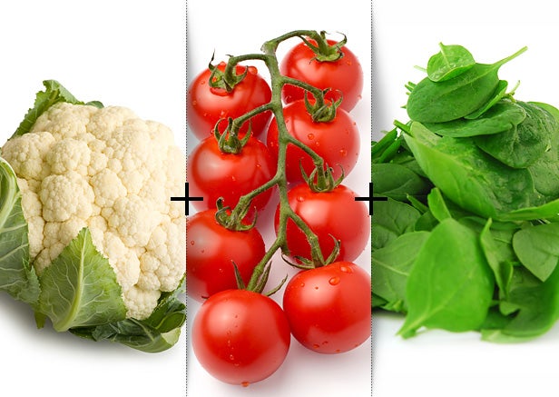 - Spray a nonstick pan and place over medium-high heat. Char cauliflower in small batches. Place charred cauliflower over spinach/tomatoes while still hot.