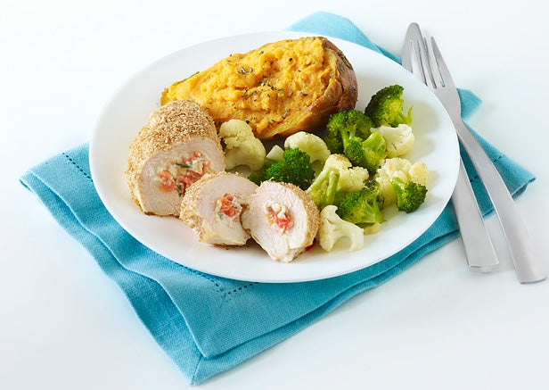 - Stuff the cheese mixture into one side of the chicken and use the other half breast to top it. Dust the top with oat bran.