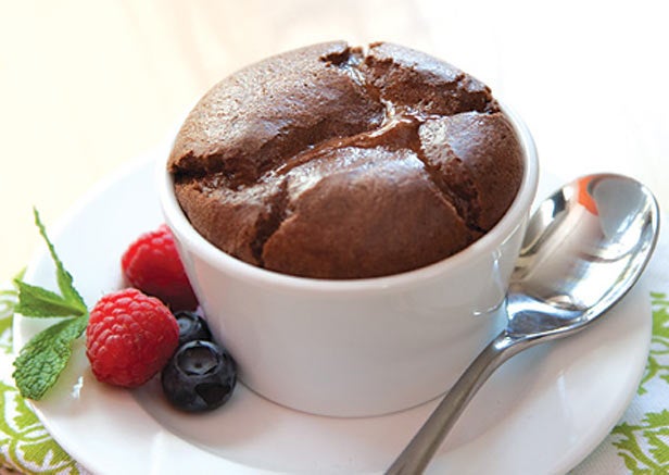 Fold 1/4 cup of the egg whites into the chocolate mixture to lighten; then gently fold in remaining whites. Divide mixture evenly into the prepared ramekins. Place ramekins on a baking sheet and bake 15 minutes, or until puffy and set. Serve immediately.