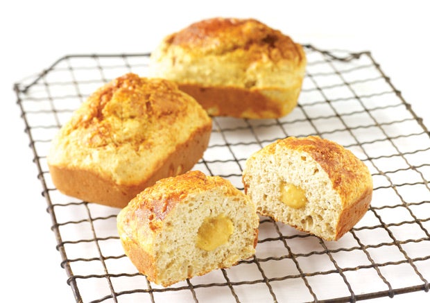 - Blend together cake ingredients and bake at 335 F in 5 mini bread loaf tins for 25 minutes, or until a toothpick inserted in the center comes out clean.