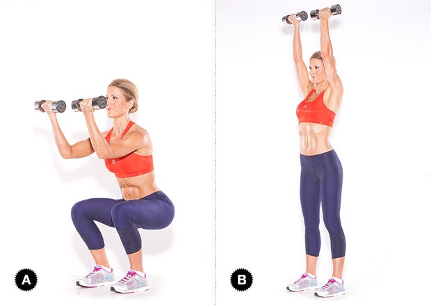 Action: Keep your knees aligned over your ankles as you bend your legs to squat, stopping when your thighs are almost parallel to floor [A]. As you extend your legs, press the weights overhead [B].