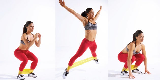 Want to work your whole body in one movement? Try the superstar jack created by Jenny Schatzle of The Jenny Schatzle Program in Santa Barbara, California. “This move will get your heart rate up, working your cardiovascular system, core, arms and legs,” Schatzle says. “Add the band and you tone your inner and outer thigh as well as your glutes and boost your heart rate and calorie burn even more.” Do three sets of 10, resting 30 seconds in between sets.