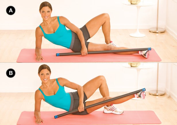 Set Up: Lie on your side: With right hip against the floor, support your torso with your right arm and extend your right leg, while bending your left leg underneath. Position a Body Bar along the length of your extended leg, putting one end across your foot while grasping the other end with your free hand for stability.