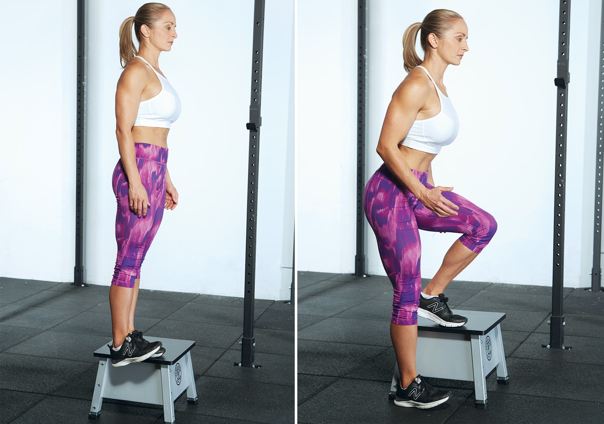 Level 2: As you step up, lift the trailing leg up behind you instead of bringing it onto the platform, flexing your glute. Step back down to the floor with that trailing leg, following with the leg atop the step. Repeat with the opposite leg leading the way.
