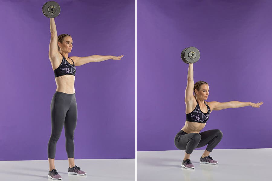 Stand with your feet shoulder-width apart and turned out slightly. Hold a dumbbell in one hand with your palm facing inward and extend your arm straight up over your shoulder. Reach your other arm out to the side for balance. Actively press the weight up toward the ceiling as you kick your hips back and bend your knees to lower into a squat, keeping your hips and shoulders as square as possible. (You might rotate a little.) Drive through your heels and stand up completely before going into the next squat. Complete all reps with one arm before switching sides.
