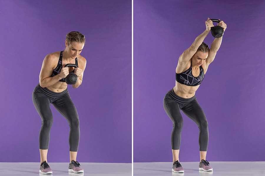Stand with your feet hip-width apart and hold a kettlebell with both hands at your chest, elbows down. Hinge forward at your hips about 45 degrees with your back straight and your shoulders retracted. Hold here as you slowly press the kettlebell upward and forward in line with your body until your arms reach full extension, then slowly pull it back to the start.