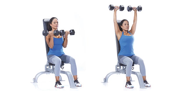 Sit on a bench with a back with your feet flat on the floor. This allows you to focus exclusively on your shoulders as you perform the lift. It’s helpful to imagine the floor as the initiation point for your power: As you execute the lift, actively press through your feet to send energy from the floor through your torso and up to the weights.
