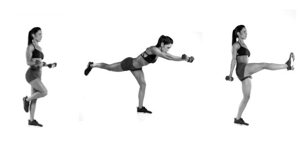 Move: Hinge at your hip to fold forward while simultaneously extending your lifted leg rearward and reaching your arms forward as if serving with a tray. Reverse these steps to stand up to the start position, then kick your free leg forward and extend your arms down to the bottom of a biceps curl to complete one repetition.