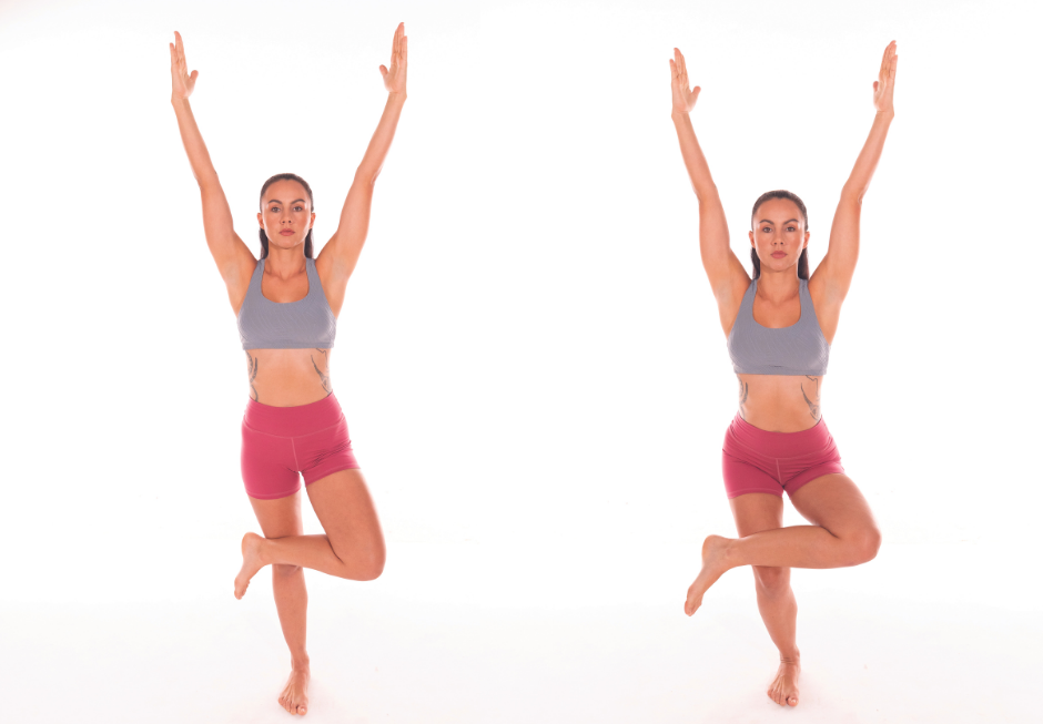 Complete five to eight reps per side. Stand on one leg with your knee straight but not locked. Bend your opposite knee and place your foot (flexed) on top of your standing leg above your knee, making a figure-4. Extend both arms straight up overhead, find your balance, then slowly bend your standing knee, squatting as low as you can while keeping your hips square and your foot flat on the floor. Hold for two seconds at the bottom, then extend your leg to rise to the start. Complete all reps on one side, then switch.