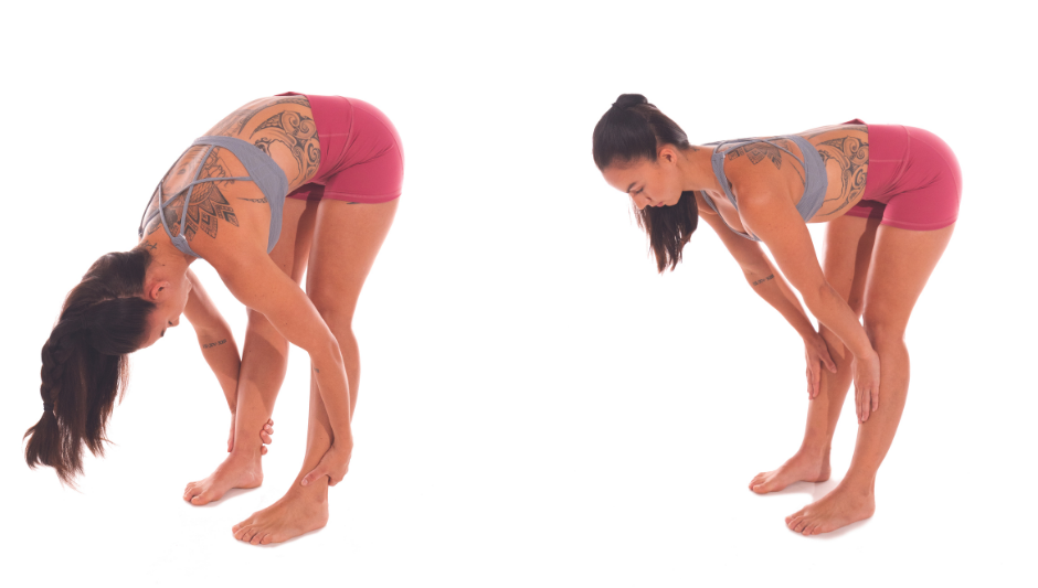 Complete five to eight reps. Stand with your feet hip-width apart and slowly fold forward as far as you can, with the aim of grasping the backs of your legs with your hands. Pause two seconds, then place your hands on your shins and lift your torso halfway up — tailbone toward the ceiling, chest to the front — while keeping your back and arms straight. Hold two seconds, then fold back down.