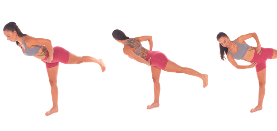 Complete five to eight reps per side. Stand on your right leg with your knee straight but soft. Extend your left leg behind you with your foot flexed, and place your hands on your hips. Hinge from your hips to fold forward, simultaneously lifting your left leg parallel to the floor. From here, open your hips and torso slowly to the left, pausing briefly at your max range of motion. Return to the start, then continue to turn your hips and torso down and in toward your right knee as far as you can. Return to the center. Do all reps on one side, then switch.