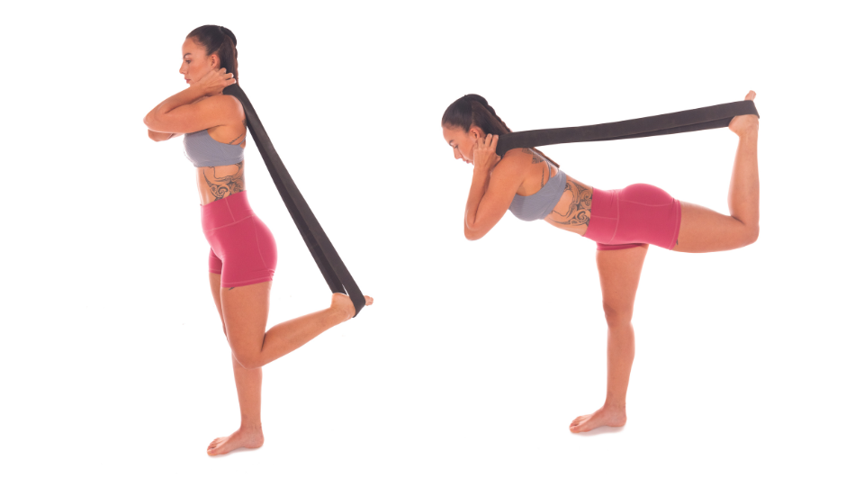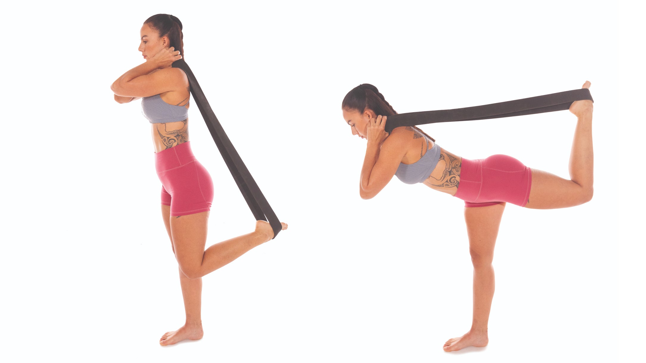 Hold 30 seconds per side. Grab a thick resistance-band loop or a yoga strap tied together in a loop. Shift your weight into your right leg, bend your left knee and loop the band over the top of your left foot. Hold the end of the band with both hands over your left shoulder and actively press down into the band and away with your left foot as you fold forward, keeping your standing leg firm and your hips square. Pause and hold at your max range of motion, then slowly return to the start. Repeat on the other side.