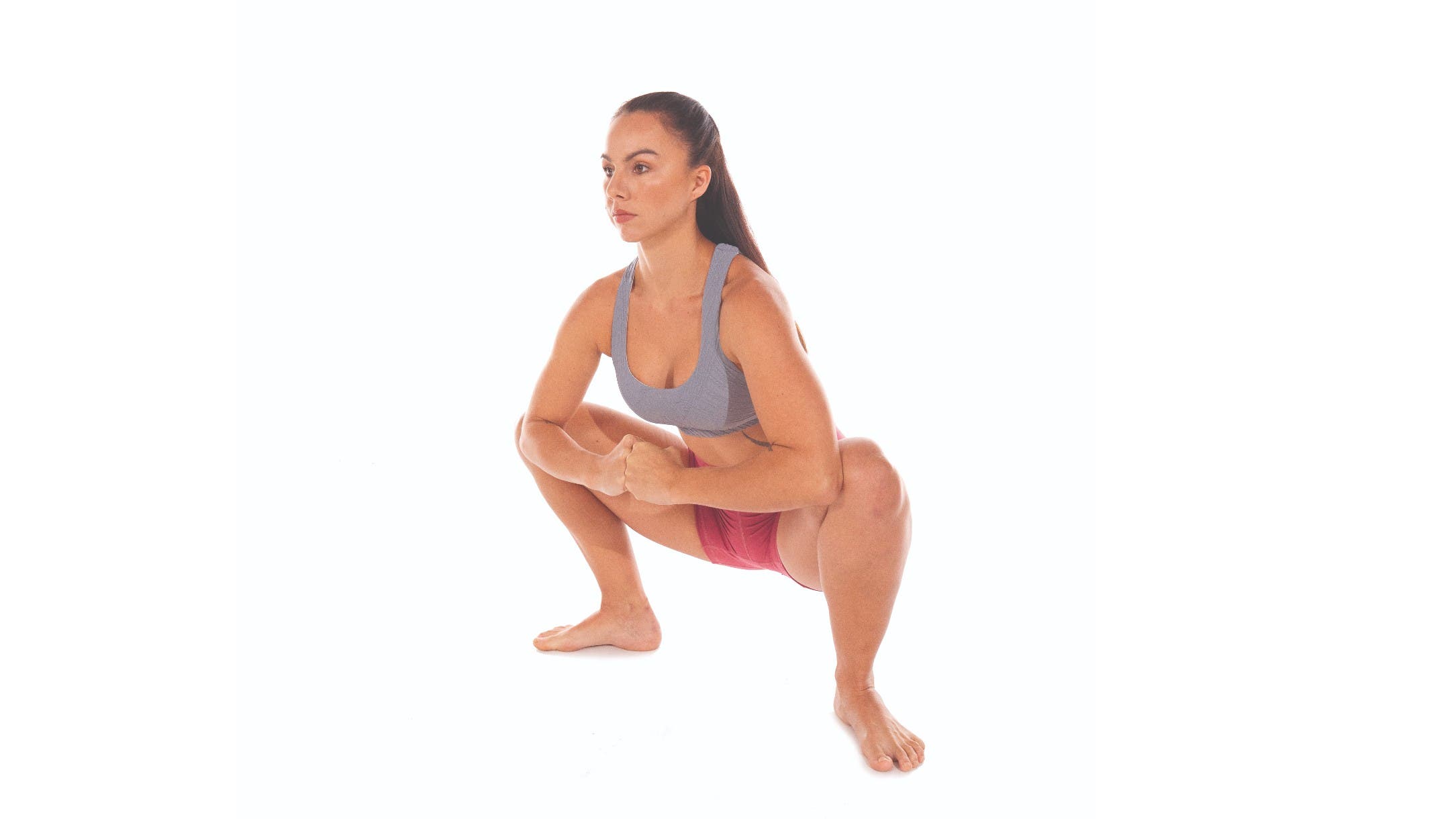 Hold 30 seconds. Stand with your feet shoulder-width apart and your legs turned out from your hips. Keep your back straight and your heels on the floor, and drop down into a low squat. Place your elbows and upper arms on the insides of your thighs, and make your hands into fists. Press your knuckles together to open your legs and hips to the sides.