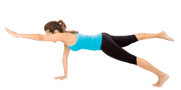 Action: Lift up your right leg and hold for 10 seconds. Replace, then repeat on your left for 10 seconds. Lift your right arm parallel to the floor and hold for 10 seconds. Replace, then repeat on your left for 10 seconds. Lift right leg and left arm and hold 10 seconds. Replace then lift left leg and right arm for 10 seconds. Replace. Hold original plank for 10 seconds. Rest 30 seconds, then repeat twice more.