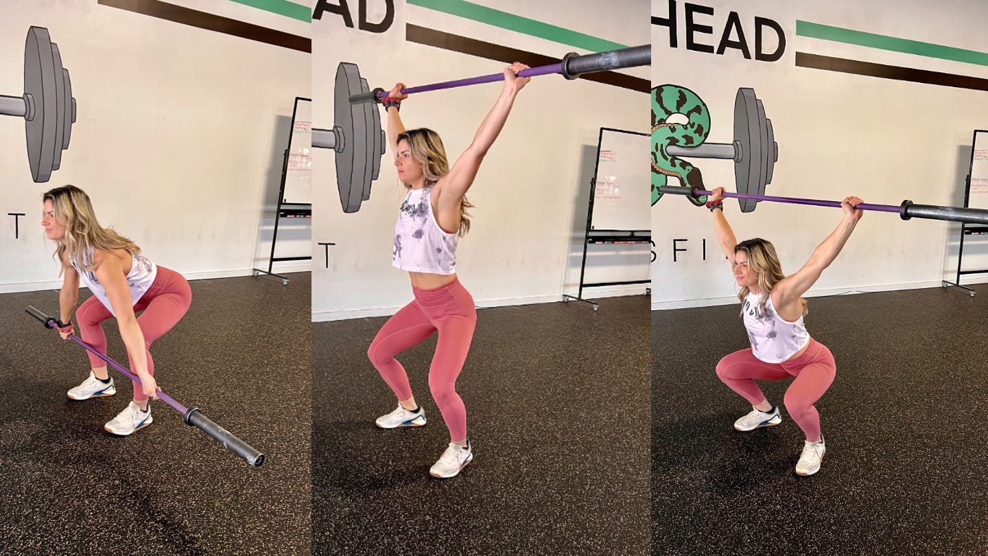 Doing this movement at a light weight is a great way to build strength and flexibility in an overhead position. The feature of the snatch that is most unique compared to the other lifts we have discussed is hand position. Your hands begin wide, while your feet and hips are in the same starting position as the deadlift. If you have never performed this movement before, find a coach or gym near you that can help you get into a good position and train the best movement patterns as you begin adding load.