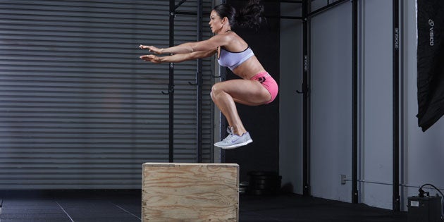 Move: Kick back your hips and bend your knees, reaching your arms back and loading up like a spring. Then quickly extend your knees and hips and reach forward with your arms, jumping onto the box and landing softly. Stand up fully on the box before stepping or jumping back off.