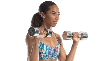 Hold two dumbbells just in front of your thighs with your palms facing forward, and pin your elbows to your sides. Don’t draw your elbows back or drag the dumbbells upward, which gives your biceps a mechanical advantage and detracts from the forearm stimulation.