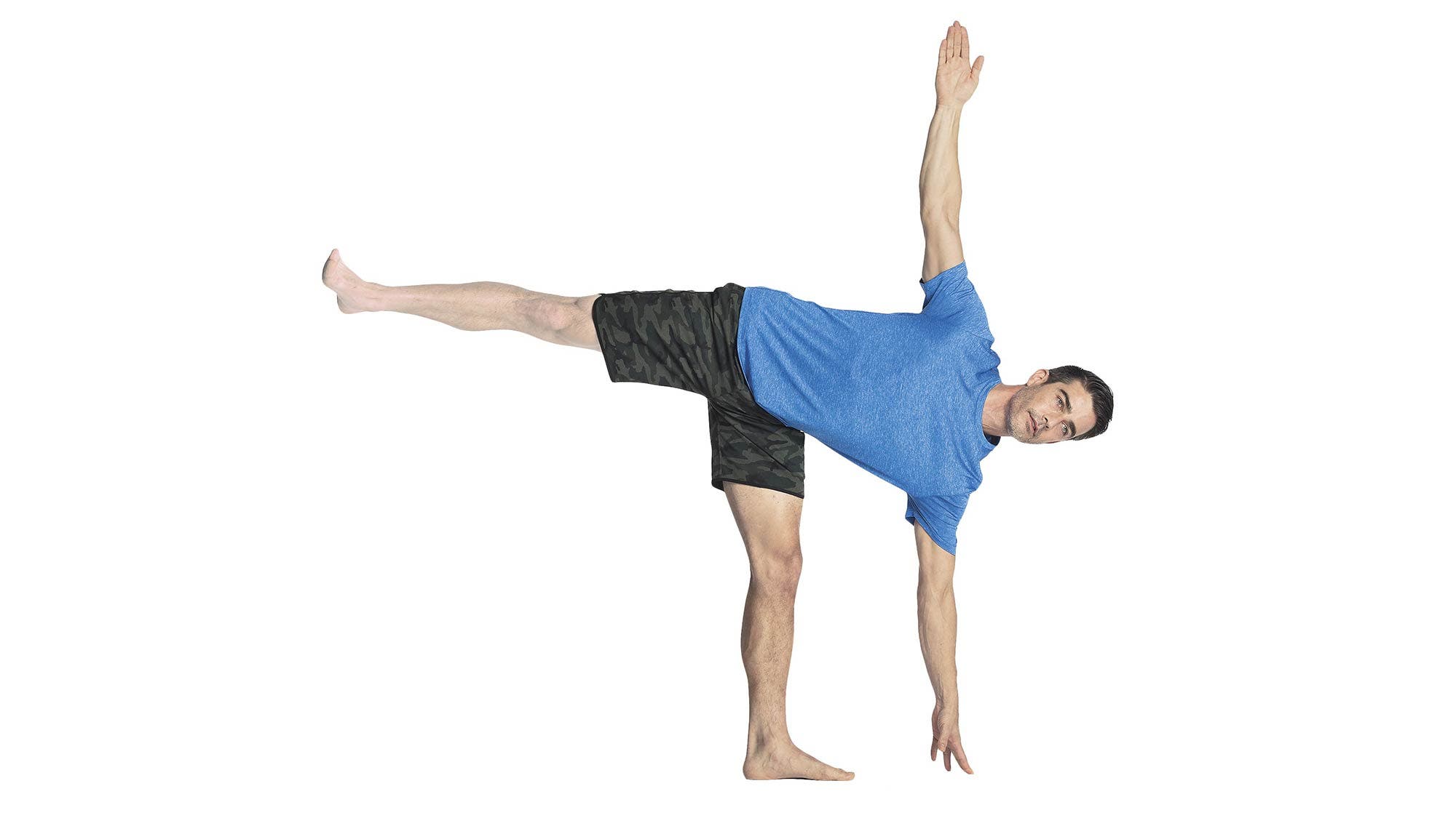 Move yourself into Utthita Trikonasana (Extended Triangle Pose) on the right side, with your left hand resting on the left hip. Inhale, bend your right knee, and slide your left foot about 6 to 12 inches forward along the floor. At the same time, reach your right hand forward, beyond the little-toe side of the right foot, at least 12 inches. Exhale and press your right hand and right heel firmly into the floor, and straighten your right leg, simultaneously lifting the left leg parallel (or a little above parallel) to the floor. Extend actively through the left heel to keep the raised leg strong. Be careful not to hyperextend the standing knee: make sure the kneecap is aligned straight forward and isn’t turned inward. Rotate your upper torso to the left, but keep the left hip moving slightly forward. Most beginners should keep the left hand on the left hip and the head in a neutral position, gazing forward. The body’s weight should primarily be on the standing leg. Press the lower hand lightly to the floor, using it to balance. Stay in this position for 30 seconds to 1 minute. Then lower the raised leg to the floor with an exhalation, and return to Trikonasana. Switch sides.
