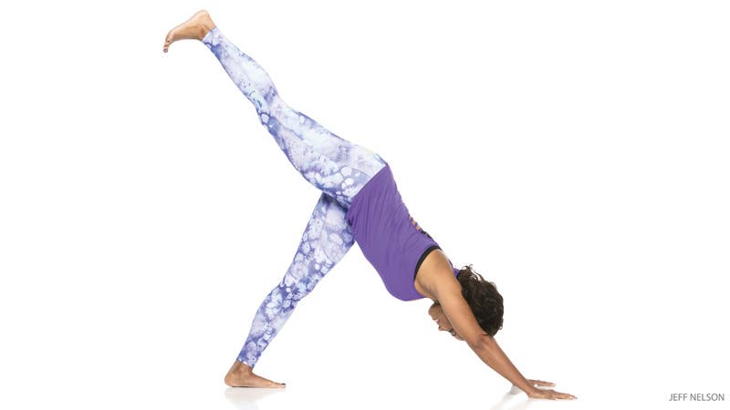 How-to: From Downward-Facing Dog Pose, lift your right leg up and back, keeping your leg straight and in alignment with your hips, torso, and arms. Distribute your weight evenly between both hands, while keeping your left leg planted firmly. Flex your right toes toward your torso while pressing through your back heel. Hold for 2–3 breaths. To release, lower your leg back to Downward-Facing Dog. Repeat on the other side.
