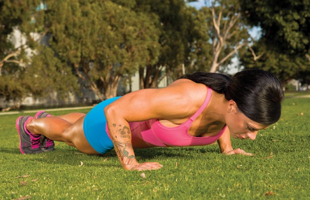 Move: Bend your elbows and slowly lower your body toward the floor for the negative. When you’re nearly touching the ground with your chest, extend your arms quickly to explode to the start.